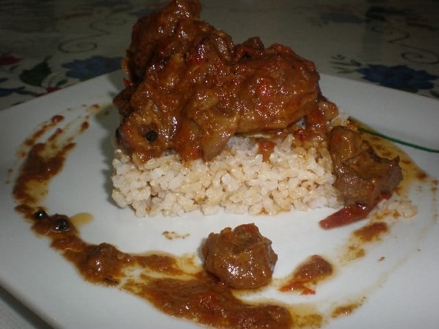 1. Emplatamos individualmente. Ayudándonos si fuera posible, de un molde cuadrado. (El cual mojamos ligeramente, con agua limpia antes de ponerlo en el plato. Eso nos ayudará a la hora de desmoldarlo). Ponemos primero la ración del arroz integral. A continuación la ración de la Carne de cabra a la sidra. Luego desmoldamos. A continuación, regamos alrededor con algo de la salsa, que nos ha quedad del guiso. Y por último retiramos el molde.