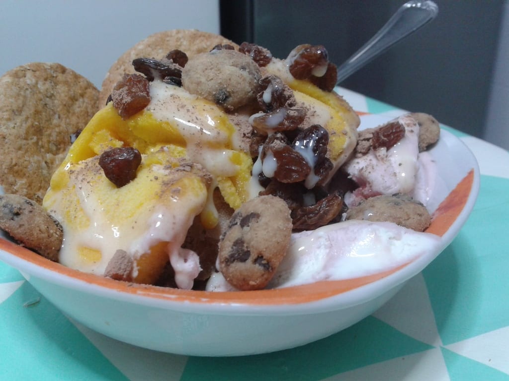 Receta de 🍨 Helado celebración. Hoy vamos a elaborar un delicioso y contundente postre a base de una variedad de helados comprados ya hechos y acompañados de galletas, pasas deshidratadas y cacao en polvo. Ideal para tomarlo en alguna celebración especial.