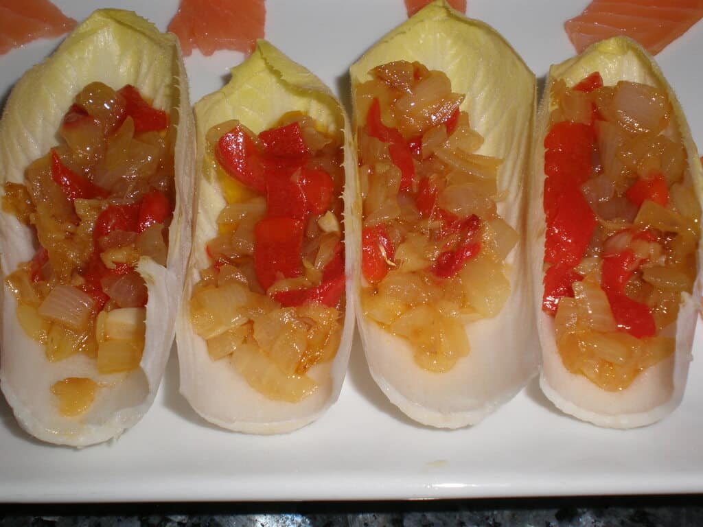 Receta de 🥬 Endivias con sofrito. Hoy vamos a elaborar una sabrosa receta de unas hojas de endivias rellenas con un sofrito de cebolla, jengibre y pimiento morrón y a la hora de servirlas irán acompañadas de salmón ahumado. En esta ocasión las voy a preparar para servirlas como entrante. Pero del mismo modo nos valdrán para servir de picoteo, así como de plato único.